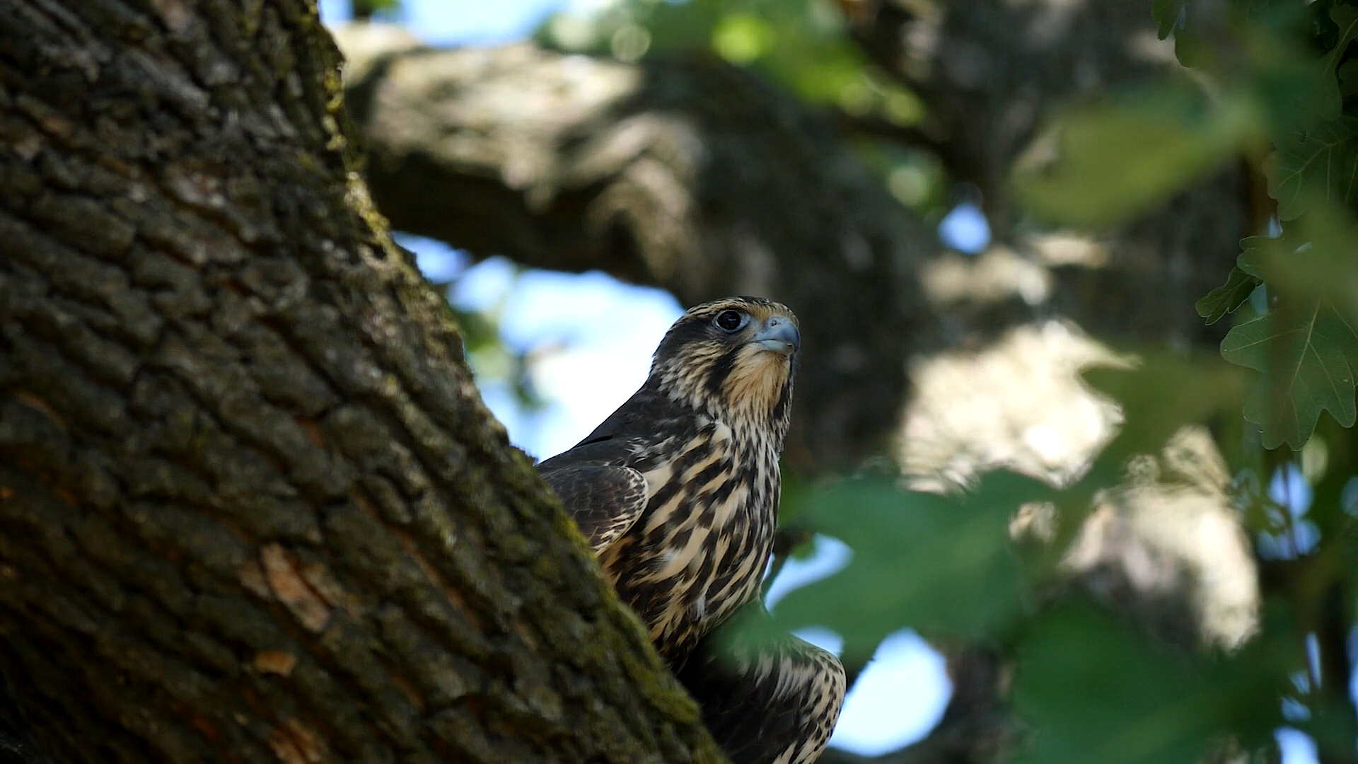 After the vet check, the sakers are placed in adaptation aviaries - hacks, imitating a nest and installed at around 10m of height on oak trees. The falcons spend ten days closed inside, in order to change all their feathers, and get accustomed to the food provision and the area through the mesh top, preventing attacks from predators in a period when the young birds are still vulnerable.